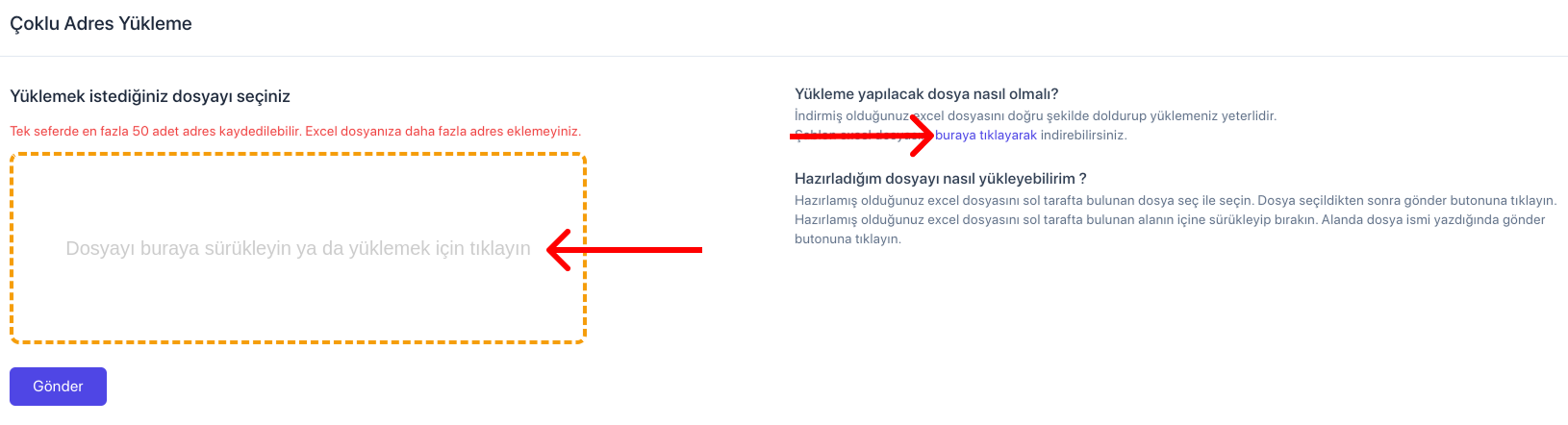 Çoklu adres yükleme yapmak için ok ile belirtilen alandan excel dosyasını indirin ve gereken şekilde doldurduktan sonra yine ok ile gösterdiğimiz alana tıklayıp/sürükleyerek dosyayı yükleyin ve gönder tuşuna basın.